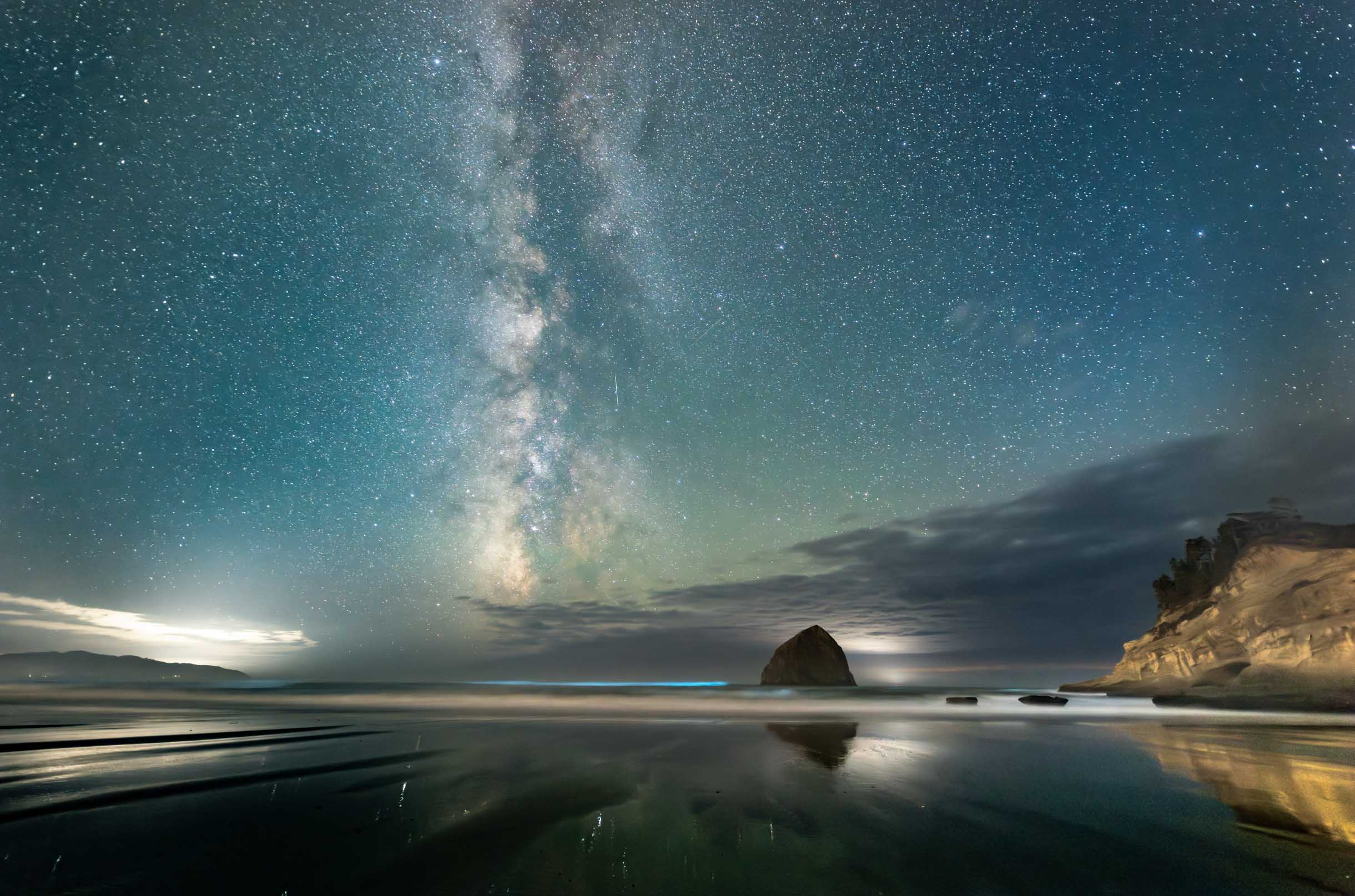 The Milky Way shines over Haystack Rock at low tide at the Pacific City beach in Oregon.
